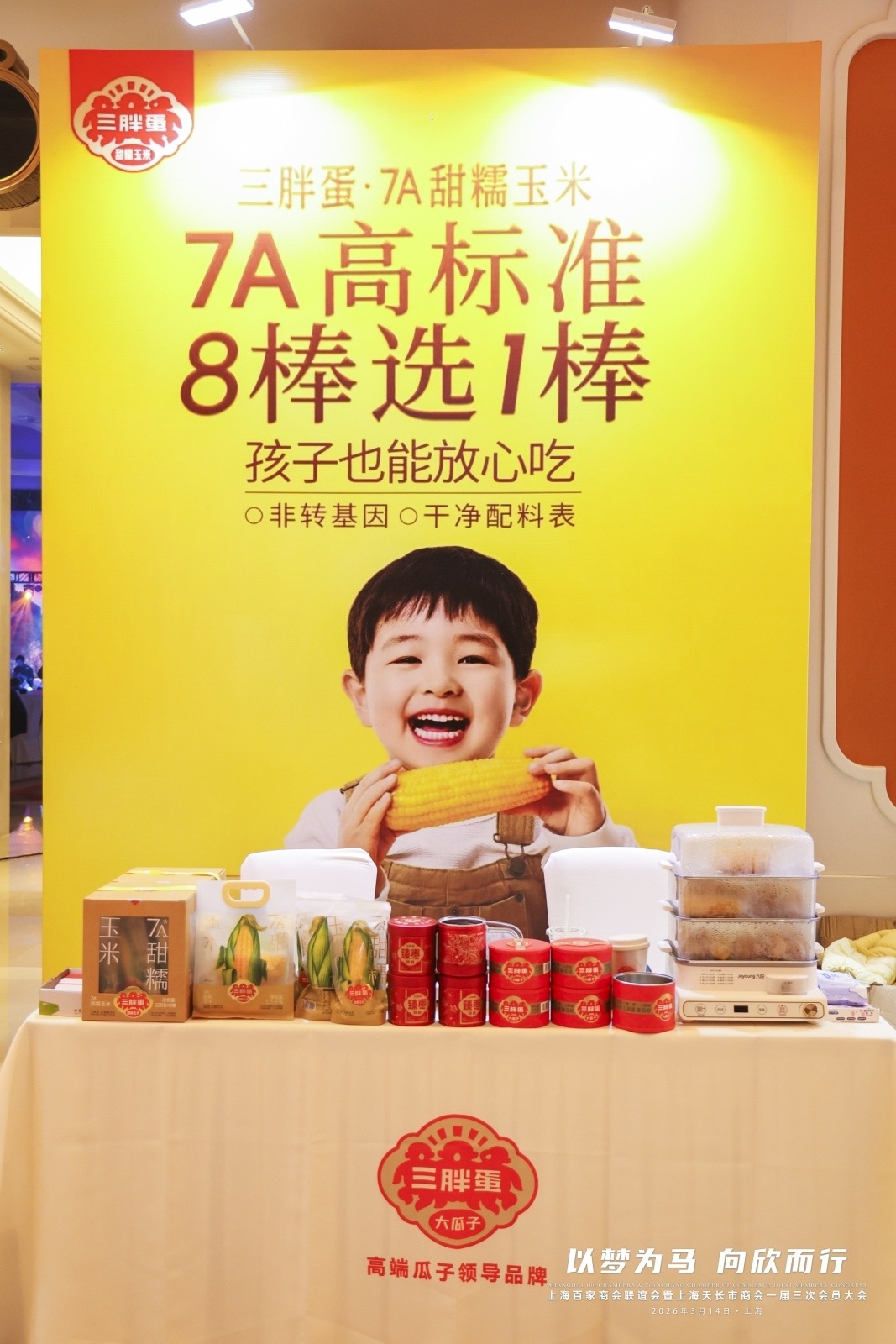 2026年3月14日,以“以梦为马,向欣而行”为主题的上海百家商会联谊会在沪隆重举行。来自全市各行业、各地区的百余家商会代表、企业家精英及社会各界嘉宾齐聚一堂,共叙情谊,共话发展。作为高端瓜子领导品牌,三胖蛋受邀成为本次联谊会的官方赞助商,以“十斤瓜子选二两”的匠心品质,携旗下明星产品三胖蛋7A甜糯玉米及经典瓜子系列亮相盛会,为这场汇聚沪上商界中坚力量的年度盛事增添了一抹独特的阳光风味,助力商会精英们在轻松愉悦的氛围中深度交流。